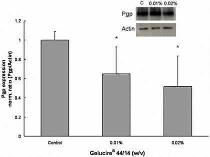 Figure 5. Gelucire® 44/14 inhibits the Pgp protein expression in Caco-2 cells. Pgp protein expression after 24 hour exposure to Gelucire® 44/14. 20 mg of total protein were separated by SDS-polyacrylamide gel electrophoresis and immunoblotted with monoclonal antibody C219 for Pgp and I-19 for actin as described under Materials and Methods. The insert is an image of a representative blot. Each bar represents the mean ± standard deviation of Pgp protein expression normalized by actin expression. Pgp expression in treatment groups were compared with Pgp expression in untreated control cells. n=4 (*P<0.05).