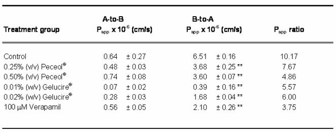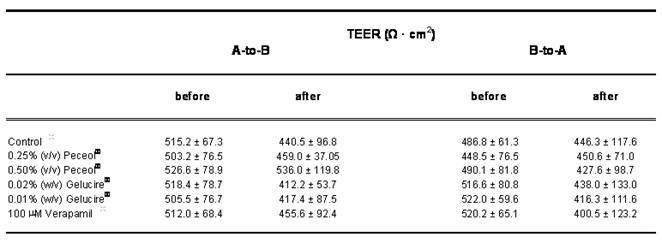 Table II. The effect of Peceol®, Gelucire® 44/14 and Verapamil on the Transepithelial Electrical Resistance (TEER). TEER values of Caco-2 cell monolayer were measured before and after the transport of Rh123 in the apical-to-basolateral and basolateral-to-apical direction in the presence of 0.25% and 0.5% (v/v) Peceol®, 0.01% 0.02% (w/v) Gelucire® 44/14 and 100 mM verapamil. TEER ratio = TEERafter / TEERbefore Data presented as mean ± standard deviation with n=3-6.
