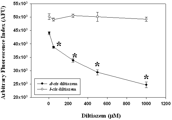 Figure 1. Piglet liver microsomes (1 mg/ml) were pre-incubated with either l-cis diltiazem or d-cis diltiazem (5, 50, 250, 500, and 1000 µM) for 1 hour at 37oC followed by 1 hour incubation with the free radical generator 2,2’-azobis (2-amidinopropane) dihydrochloride (AAPH; 1 mM) at 37oC to initiate microsomal lipid peroxidation. Control microsomes were pre-incubated with 0.25 M sucrose. The extent of AAPH-mediated microsomal lipid peroxidation was measured using a modified dichlorofluorescein (DCF) assay procedure. Data represent mean±SEM (n=8). * Significantly different from the control group (P<0.05).