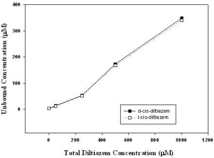 Piglet liver microsomes (1 mg/ml) were pre-incubated with either l-cis diltiazem or d-cis diltiazem (0, 50, 250, 500 and 1000 µM) for 1 hour at 37°C in water bath and then transferred to microfilters for centrifugation at 2000 rpm for 40 min to separate the unbound from the protein-bound fraction. Analysis of diltiazem was performed as previously described (13). Briefly, an iron (III)–1,10–phenanthroline solution was prepared daily (2 g 1,10-phenanthroline + 0.25 concentrated HCl + FeCl3 + 25ml H2O). The mixture of diltiazem and iron (III)–1,10–phenanthroline solution was heated in a water bath for 40 minutes before spectrophotometric analysis. Standard curve of diltiazem was determined using 0, 10, 40, 160, and 640 µM diltiazem with iron (III)–1,10–phenanthroline solution. Finally, the concentrations of diltiazem in the microsome samples were read using a Spectra Max 190 (Molecular Devices) plate reader at 510 nm.