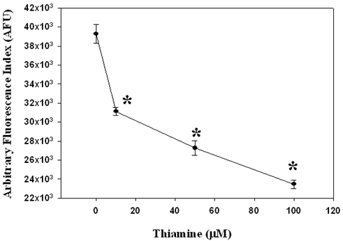 Figure 2. Piglet liver microsomes (1 mg/ml) were pre-incubated with thiamine (10, 50, and 100 µM) for 1 hour at 37oC followed by 1 hour incubation with the free radical generator 2,2’-azobis (2-amidinopropane) dihydrochloride (AAPH; 1 mM) at 37oC to initiate microsomal lipid peroxidation. Control microsomes were pre-incubated with 0.25 M sucrose. The extent of AAPH-mediated microsomal lipid peroxidation was measured using a modified dichlorofluorescein (DCF) assay procedure. Data represent mean±SEM (n=6). * Significantly different from the control group (P<0.05).