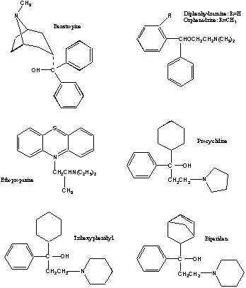 In general, the differences in the magnitude of the Cmax attained with these agents after oral administration appear to be related to the dose administered. For example, in humans, Cmax of trihexyphenidyl have been reported to be 10 ng/mL (n=1 subject); 7.15±2.58 ng/ml (n=8 subjects), and approximately 50 ng/mL (n=2 subjects) after single oral doses of 2, 4, and 15 mg, respectively, of trihexyphenidyl HCl (9-11). After a single 2 mg oral dose of benztropine mesylate (12) the observed mean Cmax was only approximately 1.5 ng/mL (n = 5 subjects). Some of these concentrations were measured using radioimmunoassay techniques (10,12), which although sufficiently sensitive, nevertheless leaves open some question regarding assay specificity. Biperiden reaches a Cmax of approximately 4 ng/mL after single oral doses of 4 mg of the HCl salt (13). The plasma concentrations of orphenadrine are much higher, with a mean ± SD of 147±39 ng/mL being attained after single oral doses of 100 mg of the HCl salt (14). Procyclidine (Table 1) provides something of an exception to trihexyphenidyl, biperiden and benztropine, since a single oral dose of 10 mg yields relatively high mean plasma concentrations of 113 ng/mL (15). This Cmax is similar to orphenadrine when given at a higher dose level of 100 mg (14). There is no published information available regarding the pharmacokinetic properties of the phenothiazine derivative, ethopropazine, in humans. The absolute bioavailabilities (F) of all of the ACP have not been reported in humans. Procyclidine, biperiden and diphenhydramine have absolute oral bioavailabilities of 0.75, 0.33 and 0.72, respectively (13,15-16). In the rat ethopropazine has a very low oral F of <5% (17). Intestine has been reported to be the site of absorption of orphenadrine in rats (18). Distribution For each of these drugs in which iv doses have been administered, a Vd exceeding total body water has been reported (Table 1). In the post-distributive phase the plasma concentrations to ACP appear to decline slowly, resulting in relatively long terminal t½ values (Table 1). Relatively low values of plasma CL and Vd (Table 1) appear to be responsible for the relatively high procyclidine plasma concentrations attained relative to other ACP (15). The tissue distribution of some ACP has been observed in laboratory animals. As expected based on the Vd, the tissue:plasma concentrations of these drugs has been reported to be large. In rats, brain:plasma biperiden AUC ratios of 7-12 have been reported (19). Recently it was reported that brain:plasma AUC ratios of 6-8 are present for ethopropazine enantiomers in different regions of brain (20). The heart:plasma concentration ratio was ~3 for ethopropazine in rat (20). The uptake of biperiden, orphenadrine and ethopropazine into the intended site of action, brain, is rapid. After short iv infusion of biperiden to rats, maximal brain concentrations were obtained within 3-10 min (19). After iv bolus doses, ethopropazine tmax in brain tissues is less than 30 min in brain (20). Radiolabelled orphenadrine and its major N-demethylated metabolite, tofenacine, attained maximal concentrations in rat brain in less than 15 min and by 60 min, respectively, after intraperitoneal administration (21). The high concentrations of these drugs in brain tissue may be related to their high lipophilicity. Brain tissues possess high concentrations of lipophilic biomolecules such as sphingomyelin and phosphatidyl choline (22), which might serve to promote the uptake of the ACP. A recent paper has indicated that high tissue uptake of trihexyphenidyl and biperiden were facilitated by intralysosomal uptake of drug (23). The extent of plasma protein binding of ACP is poorly understood in humans. In the rat, ethopropazine is extensively bound (>95%), and nonlinearity was observed in its binding (20) and pharmacokinetics (17). Orphenadrine and biperiden are approximately 90% bound to plasma proteins in animal species (24-26). Metabolism and Excretion In general, all of the ACP appear to be extensively metabolized in humans and animal species. They possess an aliphatic tertiary amine group that is amenable to N-dealkylation and N-oxidation (18, 27-31). Hydroxylation of the alicyclic groups has been reported for the structurally similar compounds procyclidine and trihexyphenidyl (28-30). Benztropine has been reported to undergo N-oxidation, N-dealkylation and ring hydroxylation in rat (31). The CL of the ACP is low in relation to hepatic blood flow (Table 1). Hence, a high hepatic first-pass effect would not be anticipated after oral administration. Several of the drugs in this class are chiral. In humans, stereoselectivity in metabolism has not been formally assessed for any of these compounds. It is known that plasma concentrations of ethopropazine enantiomers are nonstereoselective in the rat (20). The N-demethylated metabolite of orphenadrine, N-demethylorphenadrine, appears to interfere with the metabolism of the parent drug (14). Orphenadrine is known to interfere with P-450 isoenzymes (32). Both urine and bile have been shown to be pathways of elimination of unchanged ACPs and their metabolites (17, 24, 27, 33). Therapeutic Considerations Current guidelines for dosage titration Dosage regimens for ACP are largely empirical in nature, dose titration being dependent on the degree of symptom alleviation and occurrence of dose-limiting side effects, which are primarily a manifestation of peripheral anticholinergic activity (e.g. dry mouth, blurred vision, constipation). Although a few attempts have been made to determine the existence or nature of a plasma concentration vs. toxicological effect relationship after single doses (13, 15, 34), no such data are available for therapeutic effects in Parkinson's disease (e.g. reduction in tremor). Changes in salivary flow and in pupil diameter changes appear to correlate with plasma concentrations of biperiden and procyclidine after both 