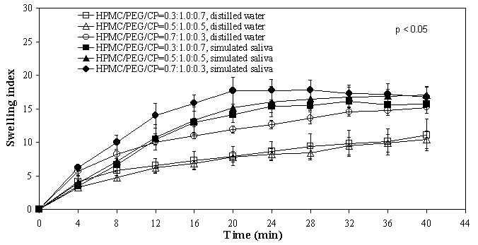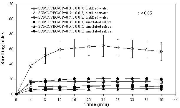 In comparison, the mean TS values of both HPMC and SCMC films were closely comparable for similar compositions, except between films containing 70% CP where the HPMC film demonstrated a significantly higher value. Increase in CP content rendered the HPMC films more elastic than SCMC films. Since HPMC (neutral polymer) and SCMC (anionic polymer) possessed different physical properties, incorporation of CP was expected to produce films with different mechanical properties. Swelling of films Figures 1 and 2 depict the degree of swelling of respective SCMC and HPMC films in both the distilled water and simulated saliva solution. Figure 1. Swelling versus time profiles of SCMC/PEG400/CP films indistilled water and simulated saliva solution Figure 2. Swelling versus time profiles of HPMC/PEG400/CP films in distilled water and simulated saliva solution Maximum swelling was seen with formulations containing high proportion of SCMC and HPMC (70%). Increasing CP content was found to reduce the extent of swelling of the films. It can be noted from the plots that the degree of swelling for SCMC films was higher in distilled water than in simulated saliva solution. Conversely, HPMC films swelled at a comparatively greater extent in the simulated saliva solution than in distilled water. These findings suggested that ionic strength and pH play an important role in affecting the swelling of HPMC and SCMC films. The effect of ionic strength and pH on the swelling of polymer has been described by Park and Robinson (16). The rate of swelling for SCMC films was comparatively faster than HPMC films. For instance, SCMC films achieved maximum/plateau in swelling at approximately 4-8 min, while HPMC films about 20-24 min in simulated saliva solution, indicating that SCMC films exhibited faster rate of water uptake and hydration than HPMC films. The swelling state of the polymer was reported to be crucial for its bioadhesive behaviour (17, 18). Adhesion occurs shortly after the beginning of swelling but the bond formed is not very strong (17). The adhesion will increase with the degree of hydration until a point where overhydration leads to an abrupt drop in adhesive strength due to disentanglement at the polymer/tissue interface. In vitro bioadhesion evaluations Table 2 depicts the mean values of in vitro bioadhesive strength of the films. A correspondent increase in the bioadhesion strength was observed with an increase in CP content, consistent with findings reported in the literature (19, 20). There was a statistically significant difference in both the work of adhesion (p = 0.016, SCMC; p = 0.020, HPMC) and the peak detachment force (p = 0.042, SCMC; p = 0.011, HPMC) between the three film preparations. Increasing CP content from 30% to 70% led to a significant increase in the work of adhesion and the peak detachment force of SCMC as well as HPMC films. However, no significant difference was observed in both the parameters between 30% and 50% CP. For SCMC films, the work of adhesion for films with 50% CP was significantly lower than films of 70% CP, although there was no significant difference in the peak detachment force. On the other hand, no significant difference was observed in both the work of adhesion and peak detachment force for HPMC films consisting of 50% and 70% CP. In general, SCMC films showed slightly higher bioadhesive strength values than HPMC films for similar compositions. Table 2. In vitro bioadhesive strength and buccal residence time of films (Mean ± SD).