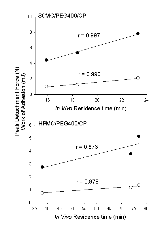 Various mechanisms have been proposed to explain the in vitro bioadhesion or mucoadhesion phenomena. These included electrical double layers, electrostatic attractions, hydrogen bonding, Van der Waals force, hydrophobic bonding, wetting, diffusion-interpenetration, physical entanglements, and surface free energy (16, 21, 22). SCMC is a polyanionic polymer bearing carboxylic groups. Its incorporation can increase the surface charge density of the films. Moreover, the carboxylic groups can form hydrogen bonds with the tissue. In addition, the SCMC films had a faster hydration rate and achieved maximum swelling at a shorter period which could promote interpenetration of the polymer chain with the tissue. All these factors may have contributed to a higher bioadhesive strength of SCMC films. Residence time on buccal mucosa The mean residence time values of various films on buccal mucosa are depicted in Table 2. As the CP content increased, the duration of adhesion increased proportionally for SCMC films from 16 min for 30% CP to 23 min for 70% CP. However, the increase in duration was not significantly different statistically (p = 0.234). In contrast, the increase in the residence time value for HPMC films was found to be significantly different statistically (p = 0.001). The mean in vivo buccal adhesion time of HPMC films containing 30% CP was significantly lower than 50% and 70% CP, whereas no significant difference was seen between films containing 50% and 70% CP. Hence, 50% CP may deemed to be sufficient as above which no further enhancement in bioadhesive strength was observed. In vitro/in vivo correlation Figure 3 illustrates the relationship between the in vitro bioadhesive strength data and the mean values of in vivo buccal residence time of both the SCMC and HPMC films. Figure 3. Correlation between mean in vitro peak of detachment () and work of adhesion () with mean in vivo residence time. Linear regression lines are shown. The SCMC films exhibited correlation coefficient value of 0.990 for work of adhesion and 0.997 for peak detachment force, while the HPMC films 0.978 for work of adhesion and 0.873 for peak detachment force, respectively. However, when the relationship of these parameters were compared between the two polymers, a greater bioadhesive strength value was obtained in vitro by SCMC films but in vivo by HPMC films, showing absence of rank correlation. Wetting has been reported essential for establishment of intimate contact between the mucoadhesive and mucin/tissue to develop strong adhesive bond (23). Moreover, an increase degree of hydration may increase the chain segment mobility, which could lead to increase interdiffusion of polymer and mucin/tissue (24). In the measurement of in vitro bioadhesive strength, the contact time between the film and tissue wetted with simulated saliva solution was relatively short (10 s). It follows that since SCMC films hydrated at a faster rate and attained maximum swelling at a shorter period, it is thus anticipated that its in vitro bioadhesive strength should be greater than HPMC films which hydrated at a slower rate. However, an optimum water concentration has been reported by Park et al. (25) for hydrocolloid particle to develop maximum adhesive strength and the adhesives would subsequently lose their adhesiveness if they became too susceptible to water since they would be eventually displaced by water. In the evaluation of residence time, the films were placed on the buccal mucosa and hence the contact time was sufficient for both films to reach maximum hydration. As such, SCMC films which achieved maximum swelling faster, would then be expected to be displaced by water sooner than the HPMC films. These may help to explain the higher in vitro bioadhesive strength but shorter in vivo buccal residence time of the SCMC films compared to that of HPMC films. Conclusions In conclusion, CP was found to increase the softness, elasticity and bioadhesive strength of the SCMC and HPMC films. HPMC films appeared to be tougher, more elastic, more bioadhesive in vivo and swell at a more reasonable rate than SCMC films, suggesting that HPMC films may be more preferred as drug vehicle for buccal delivery. Although correlation existed between the in vitro and in vivo bioadhesion data within the polymer, no rank correlation was observed between the two different polymers. References