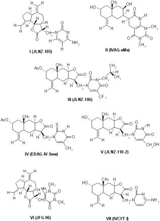 Guzmán and Eduardo Díaz PDF Version for printing Abstract Sesquiterpene lactones display a wide variety of biological effects such as antiviral, anti-inflammatory and cytotoxic activity. In previous studies some derivatives of sesquiterpene lactones were prepared to be tested as antiviral and/or cytoxic agents. In the present report we describe the effects of seven modified sesquiterpene lactones on the proliferation of several cancer cell lines. We demonstrated antitumoral activity of two of them: III (JLNZ-106) and IV (EDAG-IV-Sme) in HeLa, C-33, CALO, INBL, VIPA, SW480, SW620, MCF-7 and CHO cancer cell lines. Compounds III (JLNZ-106) and IV (EDAG-IV-Sme-IV) presented cytotoxic activity (IC50) by inhibiting the incorporation of 14C-thymidine to DNA. These experiments suggest that derivatives III and IV should inhibit DNA replication in cancer cell lines.Introduction Sesquiterpene lactones are natural products, which show very interesting biological activities (1, 2, 3), for example, methyleneactocine or dehydrolichestenic acid present antibiotic and antitumoral effects. In addition, ivalin acetate has shown antileukemic properties. Some sesquiterpene lactones isolated from Arnica species were tested on human carcinoma cell line as well as on COLO 320, a human colorectal cancer cell lines, where they showed cytotoxic activity (3). Evidence that these compounds exhibit considerable antitumoral activity on Ehrlich ascites, on Walter 256 carcinosarcoma and against leukemia, has been presented which suggest these compounds inhibit DNA synthesis in cancer cells (3). As well, the Michael addition of dipeptide L-Cys-L-Ala-OCH3 to alantolactone yields compounds which shown interesting biological activities has been described (4). Here we describe the cytotoxic activity (5, 6) of seven new derivatives (I-VII) synthesised from dehydrocostus lactone, ivalin acetate and zaluzanine diacetate whose structures were previously published (7, 8). Materials and Methods Chemicals: