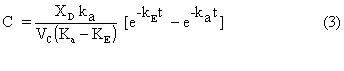 OF is the calculated value of the objective function. 2 Values inside brackets are obtained from the graphical method (1) and those outside brackets are obtained from the optimization algorithm in this work. where Wi’s are the weighting factors specified for each data point. The results presented in Table I and Figures 2 and 3 represent an objective function with Wi = 1 for all data points. If one wishes to place more weight on the early time data, the corresponding Wi for early time experimental points could be set at a higher value (for example 5). In such a case the optimized parameters would result in very accurate prediction in the early stages at the expense of a loss in accuracy of the predicted concentrations in the late stages. This flexibility is a major advantage of the methodology described in this paper over common graphical methods. Furthermore, the present methodology can be very simply extended to the more complex multi-compartment models. In the case of oral administration, an important parameter is the drug volume of distribution, Vd. As can be seen from equation (10), an important parameter which has to be specified in the optimization procedure is the initial condition C0 = XD F/Vd at t = 0. The reported literature value for bioavalability, F, for ofloxacin and ciprofloxacin was 0.6 and 0.95, respectively. Since the drug dose in oral administration is specified for each experiment, the value of the optimized parameters and the corresponding objective function value would depend on the specified value of Vd. In the case of i.v. doses, the initial condition that has to be specified (equation 6) is C1 = C1,max at t = 0 where C1,max is the initial drug concentration in the central compartment after an i.v. dose which is taken as the first plasma concentration immediately after an i.v. dose. Figure 4 indicates that in the case of ofloxacin, the optimum value for Vd which provides the least value for the objective function, the best estimation, is about 39 liter for adults and 21 liter for children.