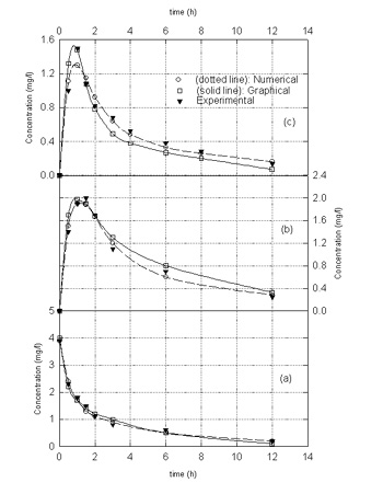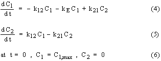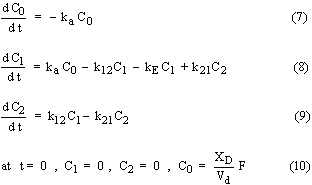 Amir Mahbod Ahmadi, and Abbas Gerayeli Department of Pharmacy and Pharmaceutical Sciences, University of Alberta, Canada PDF Version for printing Abstract Purpose. For simple pharmacokinetic compartmental models, analytical solution to the governing differential equations along with common graphical methods provide a mean to evaluate the associated rate constants. These graphical methods, however, can not be used for the more complex multi-compartment models. Furthermore, parameter estimation using slope and intercept values from the graphical methods is often accompanied with error. In this study a numerical solution is applied for the solution of the governing differential equations and a simple direct search optimization procedure utilizing random numbers is used for pharmacokinetic parameter estimation. Method. The methodology is demonstrated with reference to experimental literature data for ciprofloxacin and ofloxacin whose pharmacokinetic behavior has been reported in terms of a two-compartment model. Results. Examination of the predicted drug concentrations from the graphical method and the optimization methodology indicate that both methods have comparable accuracy in predicting the drug concentrations. The graphical method, however, only shows good accuracy in the early stages both after i.v. and oral drug administration whereas the optimization procedure, due to the nature of the objective function formulation, provides good accuracy over the entire range of times after drug administration. Conclusions. The methodology is simple, provides optimized parameters which accurately predict drug concentrations, and is flexible to include more weight on the early-time data or be extended to multi-compartment models. Introduction Pharmacokinetic models are used to describe drug absorption, distribution, and elimination in human and animal body. In these models, the body is described in terms of one or more compartments to and from which drugs could be absorbed, transferred, and eliminated according to simple kinetic rate expressions. These expressions result in one or more ordinary differential equations with time as the independent variable. The solution to these equations would give the drug concentration in each compartment as a function of time. For the simple single-compartment and two-compartment models, analytical solutions for the governing differential equations are readily available and simple graphical techniques can be used for pharmacokinetic parameter estimation. These graphical methods, however, are only applicable for simple models and can not be used for the more complex multi-compartment models. Furthermore, parameter estimation using slope and intercept values from the graphical methods is often accompanied with error. In this study a numerical solution is applied for the solution of the governing differential equations and a simple direct search optimization procedure utilizing random numbers is used for pharmacokinetic parameter estimation. This methodology is demonstrated with reference to experimental literature data for ciprofloxacin and ofloxacin. The pharmacokinetic behavior of these antibacterial drugs which belong to the flouroquinolones family has been reported in terms of two-compartment models. Single Compartment Models Compartmental models have been used extensively to describe the time course of drugs in the body. The simplest of such models is the single compartment model. Drug elimination from this compartment is represented by a first order elimination rate constant, kE. In the case of an i.v. dose, the drug concentration in the compartment (plasma concentration) is given by the following expression: where C0 is the initial drug concentration and C is the drug concentration in the plasma which could be measured experimentally from blood samples taken at different times. In the case where administration of drug into the central compartment is via infusion with a zero order rate constant, the following expression is obtained: For an oral dose, absorption of drug into the central compartment is usually represented by a first order absorption rate constant, ka, and analytical solution to the governing differential equations results in the following expression for the drug concentration: where VC is the volume of the central compartment and XD is the drug dose. Pharmacokinetic parameters for the single compartment models can be estimated from the experimental drug concentration as a function of time, C, using common graphical procedures outlined elsewhere (1). Multi-Compartment Models In multi-compartment pharmacokinetic models, the body is considered in terms of two or more compartments including a central compartment. Distribution of drug can occur in all compartments whereas absorption and elimination is usually considered for the central compartment only. Although various multi-compartment models have been proposed (1), the pharmacokinetic behavior of most drugs can be represented by single or two compartment models. For the two compartment model with an i.v. bolus dose, the governing differential equations and associated initial conditions are as follows: where C1,max is the initial drug concentration in the central compartment after i.v. bolus dose and C1 and C2 are the drug concentration in the central and second compartment, respectively. The equations for a two compartment model with an oral dose are similar except that an additional term involving drug absorption in to the central compartment is considered with a first order absorption constant ka. The governing differential equations and associated initial conditions are as follows: where Vd is the drug volume of distribution. Analytical solution results in the following expressions for the drug concentration in the central compartment: Equation (11) is for an i.v. bolus dose and equation (12) is for an oral dose. The parameters, for example L, M, N, a, b, and ka in the case of an oral dose, ar