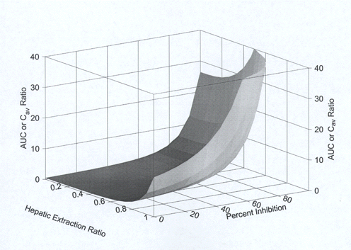 Through algebraic combination of Equations 1-3, a three dimensional plot of ER, %I and R was constructed and is illustrated in Figure 1. Visual inspection clearly indicates that drug exposure enhancement (measured by AUC or Cav) is highly dependent on both ER in the absence of inhibitor, as well as the extent of inhibition (dependent on inhibitor plasma concentration and Ki). Of particular interest is the observation that high clearance drugs (i.e., those with high ERs) are at greater risk of significant increases in exposure in the presence of an inhibitor. This helps explain why intact terfenadine (predominantly a P450 3A4 substrate) exposure increases approximately 37 fold during co-administration with high-dose ketoconazole (200 mg po Q 12 h). Its ER is reduced from ~95% (alone) to ~35% (with high-dose ketoconazole) (1). There are at least a few ways of ascertaining in vivo Ki values (1). Utilizing literature data (1-3), the Ki plasma values for ketoconazole and clarithromycin inhibition of CYP 3A4 (triazolam substrate, predominantly CYP 3A4 eliminated) in healthy human subjects have been determined as ~1.24 mg/mL and ~0.52 mg/mL, respectively. (In theory, Ki values are substrate independent in purified enzyme preparations, although this will require validation in vivo).