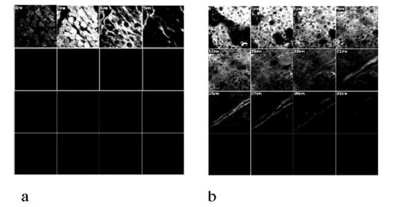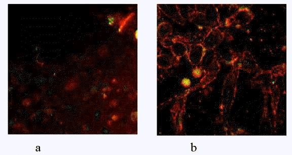An optical section a few microns in depth through the epidermis after exposure to the Athru-Derm-Nile red conjugate (fig.5) revealed the presence of intact emzaloid particles associated with the membranes, which could be seen to move laterally in time. Furthermore only those emzaloid particles smaller than a micron in diameter could be observed in these regions. In the depth study, the Nile red associated with Athru-Derm was visualised at a skin depth at least 4 times that of the Nile red in the control (fig.6). Human melanoma cells: The Alexa 568 –diclofenac conjugate in the presence of Meyer Zall formulation has a strong affinity for the cell membranes of the melanoma cells, as illustrated by the green fluorescence (fig.7).