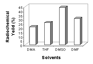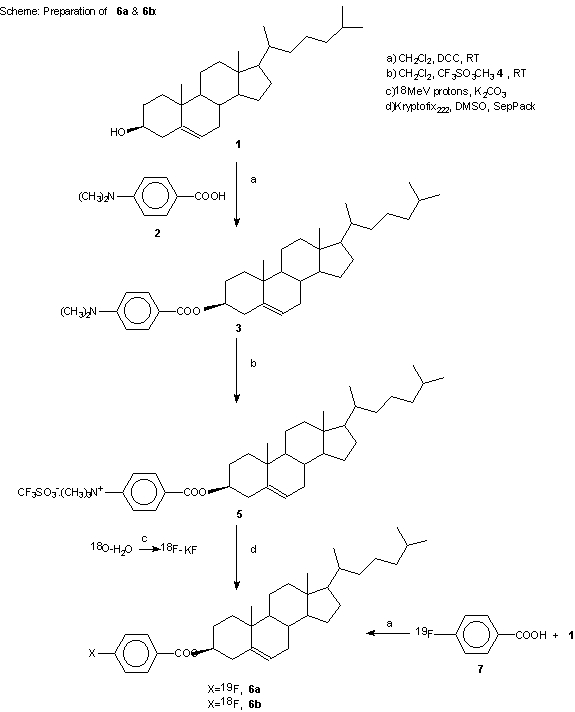the 18F-labeling reaction. Cholesteryl 4-dimethylamino benzoate (3). A mixture of 4-dimethylaminobenzoic acid 2 (165 mg, 1 mmole), cholesterol 1 (386 mg, 1 mmole) and dicyclohexyl carbodiimide (DCC) (206 mg, 1 mmole) in anhydrous dichloromethane (10 mL) was stirred vigorously for 24 hrs at room temperature. The mixture was filtered and the filtrate was evaporated. The residue obtained was crystallized from ethyl acetate-hexane to give 375 mg (70%) of 3 as a light colorless powder; m.p. 89-92 °C; IR (KBr) 1736 cm-1 (s, C=O). 1H NMR (CDCl3) d (ppm) 6.81-8.07 (m, 4H, aromatic), 5.29 (m, 1H, C6-H), 3.41-3.48 (m, 1H, C3-H), 3.08 (s, 6H, CH3), 0.67-2.56 (m, 43H, aliphatic). MS: m/z (%) 533 (M+, 76), 386 (51), 371 (100), 368 (69), 353 (66), 164 (46). Cholesteryl 4-fluorobenzoate (6a). This product was prepared according to the procedure described above for the preparation of 3, using equimolar amounts of acid 7, cholesterol 1 and DCC in anhydrous dichloromethane and subsequent recrystallization from ethyl acetate-hexane. (65%) m.p. 179-182 °C; IR (KBr) 1652 cm-1 (s, C=O), 1241 (s, C-O). 1H NMR (CDCl3) d (ppm) 7.45-7.66 (m, 2H, aromatic), 6.95-7.21 (m, 2H, aromatic), 5.32-5.37 (m, 1H, C6-H), 3.41-3.48 (m, 1H, C3-H), 0.68-2.45 (m, 43H, aliphatic). MS: m/z (%) 508 (M+, 68), 386 (48), 371 (100), 368 (55), 353 (69), 140 (43). Cholesteryl 4-N,N,N-trimethylanilinium trifluoromethane sulfonate (5). Compound 5 was synthesized by reaction of methyl trifluoromethanesulfonate 4 with 3 in anhydrous dichloromethane at room temperature according to the literature (7). Compound 4 (25 mL, 0.1 mmole) was added to a solution of 3 (53 mg, 0.1 mmole) in anhydrous dichloromethane (10 mL) in one portion. After stirring for 2 hrs, the mixture was filtered and the solid was crystallized from dichloromethane-ether mixture to give 60 mg (86%) of 5 as fine colorless crystals; m.p. 192-195 °C; IR (KBr) 1690 cm-1(s, C=O), 1269 (brs, CF3SO3), 1132 (C-O); 1H NMR (DMSO) d (ppm) 6.65-7.29 (m, 4H, aromatic), 5.35 (m, 1H, C5-H), 3.63 (s, 9H, N(CH3)3), 3.36 (m, 1H, C3-H), 0.55-2.43 (m, 43H, aliphatic). MS: m/z (%) 697 (M+, 67), 548 (54), 386 (55), 371 (100), 368 (74), 353 (67), 149 (81). Fluorination of Cholesteryl 4-trimethylanilinium triflate (5). To a vial containing potassium fluoride (40 mg, 0.69 mmole) in water (0.5 mL) and Kryptofix2.2.2 (4,7,13,16,21,24-hexaoxa-1,10-diazabicyclo[8.8.8] hexacosane) (200 mg, 0.54 mmole) in acetonitrile (1 mL), 5 mL acetonitrile was added. The mixture was stirred and then dried under an argon stream. A second 5 mL aliquot of acetonitrile was added and dried again. The vial was cooled and a solution of 5 (153 mg, 0.22 mmole) in DMSO (5 mL) was added to the dried mixture. The vial was capped and heated at 110 °C for 0.5 hr. After cooling, the mixture was mixed with water (25 mL) passed through a C18 column and washed with diethyl ether (10 mL). The organic layer was dried over anhydrous sodium sulfate and purified by preparative silica gel TLC on glass using a mixture of CHCl3-EtOAc (85:15). The desired fluoride compound was separated (Rf = 0.28). The identity of the product was confirmed by comparison with an authentic sample of 6a prepared before. Radiolabeling. Cholesteryl 4-[18F]-fluorobenzoate (6b). Product 6b was prepared from 5 using a procedure similar to that used for the preparation of 6a. A volume of target solution eluted with 100 mL of a 1% potassium carbonate (1 mg, 7 mmole) solution, containing 6 mCi of activity was transferred to a 2 mL vial containing Kryptofix222 (10 mg, 0.027 mmole) and anhydrous acetonitrile (0.5 mL). The mixture was evaporated by slight heating under a stream of argon. Drying was repeated after addition of two more 0.5 mL aliquots of anhydrous acetonitrile. A mixture of 5 (7 mg, 0.01 mmole) in anhydrous DMSO (0.25 mL) was added to the dried [18F]-isotope and heated at 110°C for 15 min. The mixture was cooled in an ice bath and rapidly drained into a syringe containing water (5 mL). The mixture was passed through a C18 Sep-Pak column. The column was washed with diethyl ether (1 mL) and the eluted solution was passed through a short silica column. The radioactive solution was checked for radiochemical purity by developing one drop of the latter solution using a polymer-backed silica gel layer with chloroform as the mobile phase. Administration of [18F]-cholesteryl 4-fluorobenzoate (6b) to mice Mature female NMRI mice (Pasteur Institute, Iran) weighing 20-25g (n =10) were used in experiments. The animals were kept in groups of ten, in cages under constant temperature (24°C) and 12 hr light/dark schedule. They had free access to standard mouse diet and tapwater except during the experiment. On the day of the experiment, animals were transferred to individual cages randomly and allowed to acclimatize for 30 min before injection of radioligand. Ethinyl estradiol was suspended in a mixture of Tween 80 solution (0.5%) and carboxymethylcellulose solution (1%) and the mixture was well mixed. The animals were divided into 2 groups. In the first group of ten mice, ethinyl estradiol was injected subcutaneously in the thigh 2 hrs before the injection of 18F-CFB in order to increase cholesterol derivative uptake into adrenal and ovarians (8). The second group of ten (control animals) was given only 18F-CFB injected in the same manner. The dried active residue obtained according to the above procedure was dissolved in borate buffer (0.5 mL) with shaking and warming for 30 sec. Enhanced radioligand uptake was observed 30 min after ethinyl esteradiol injection as previously mentioned (9). After 1 h various tissues were dissected and proportional uptake of 6b in different organs was measured by a gamma detector. Results Our group is interested in labeling different precursors that are localized in different organs. Since fluorine-18 has a half-life of only 110 min, it is important that labeling methods employing this nuclide be fast, give high yields and involve minimal