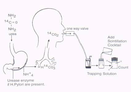 Koslowsky Nuclear Medicine, Dept. of Diagnostic Radiology, Queen Elizabeth II Health Sciences Centre, Victoria General Site, Halifax, Nova Scotia, Canada PDF version for printing SUMMARY Helicobacter pylori bacteria reside in the mucosal lining of the stomach where, due to a variety of factors, the infection predisposes patients to peptic ulcer disease. Detection of H. pylori is important in the treatment and follow-up of patients with peptic ulcer disease and the urea breath test is the method of choice. This article will briefly review the methods for diagnosing H. pylori, emphasizing the [14C]urea breath test. The agents which can interfere with the results of the breath test will be reviewed and the role of the consulting pharmacist will be discussed. Introduction The diagnosis and treatment of ulcers has changed considerably during the last two decades since Warren and Marshall implicated Helicobacter pylori in the genesis of peptic ulcer disease (1). Subsequently, there has been general agreement in the medical community that bacterial infection with H. pylori is causally related to cases of duodenal and gastric ulceration and to chronic gastritis (2-4). While approximately 30 to 50 % of asymptomatic controls culture positive for H. pylori, more than 90 % of patients presenting with duodenal or gastric ulcer are positive (5). Infected adults are at a 3.2 to 5.5 fold increased risk of developing peptic ulcer disease compared to the uninfected population, but the development of clinically significant sequelae seems to depend on the pathogenicity of the H pylori strain (5, 6). Eradicating H. pylori heals ulcers independent of other therapy and the addition of antibiotics to the therapeutic regimen has been shown to dramatically reduce the rate of ulcer recurrence. The Consensus Development Panel of the National Institutes of Health now recommends that all patients diagnosed with peptic or duodenal ulcers that are infected with H. pylori receive antimicrobial therapy (7). Although most ulcer therapy provides excellent initial healing, the relapse rate between various regimens can differ significantly. The most effective therapy of H. pylori requires multiple drug treatment involving various combinations of antibiotics, histamine blockers, proton pump inhibitors and bismuth salt preparations (8, 9). In addition to potential classical drug interactions, the diagnostic tests used to confirm eradication are also subject to interference from many drugs. Therefore, the pharmacist has an important role in both the treatment and diagnosis of peptic ulcer disease. H. pylori colonize the gastric epithelium in the stomach, causing acute inflammation progressing to superficial gastritis then to chronic atrophic gastritis. Acute infection leads to parietal cell dysfunction and acute hypochlorhydria, which increases gastrin and acid secretion. However the gastric pH soon returns to normal due to the release of bacterial urease which neutralizes the increased acid. This urease, which shows little difference between bacterial strains, is important in establishing chronic infection. The bacteria also induce a local inflammatory response attracting neutrophils, T cells, plasma cells and macrophages, but the bacteria, in their niche in the gastric mucosa, are not readily accessible to the antibodies produced. The H. pylori strains most involved in peptic ulcer also produce cytotoxins which promote the inflammatory response and reduce duodenal bicarbonate secretion (5). Diagnosis The presence of H. pylori can be diagnosed by different modalities which exploit various properties of the bacteria. These include endoscopy followed by histologic analysis, bacterial culture or urease testing of the biopsied sample, serologic detection of the antibody response, or detection of urease production by the carbon urea breath test (10). Endoscopy with biopsy is the gold standard for detection of H. pylori, however, it is a relatively expensive and invasive procedure that is dependent on an experienced observer (10). Detection of the bacteria in a culture of the biopsy material is comparable to the precision of histologic examination of the specimen (specificity is 100 % for both procedures), but is more difficult to perform. The sensitivity (80 to 95 %) of histology is somewhat higher than tissue culture (sensitivity 60 to 90 %) but the need for multiple specimens to be examined by an experienced pathologist adds to the cost of endoscopy. Testing the biopsy sample for the presence of urease is a much simpler, quicker and less expensive test than either culture or histology and has high sensitivity (90 to 95 %) and specificity (98 to 100%). However, a biopsy sample is still required. Serology tests detect the antibodies (determined by using radioimmunoassay techniques) produced in response to the infection and are useful to determine whether the patient has been exposed to H. pylori. The test has good specificity (98 to 100 %) and is the only procedure which is not influenced by prior antibiotic, bismuth compound, or omeprazole therapy. Unfortunately, a positive serology test can only presume current infection since the serum antibody titres to the bacteria decline slowly after eradication therapy (11). Therefore, long term follow up is required to ascertain the magnitude of this reduction limiting the use of serology in patient follow up post antibiotic treatment. The [14C]carbon urea breath test is a sensitive, non-invasive test which can be used to determine the presence of H. pylori prior to initial treatment and for follow up after antibiotic therapy (12-15). The test is based on the detection of the enzyme urease, which is secreted by the bacteria to convert urea to ammonia. This produces an alkaline environment which facilitates their survival in the mucosal layer of the stomach. In the presence of urease, the [14C]urea is converted into [14C]bicarbonate and ammonium ions. The [14C]bicarbonate anion is absorbed 