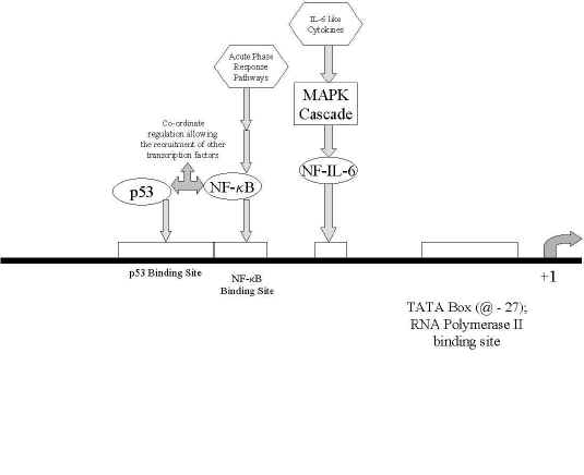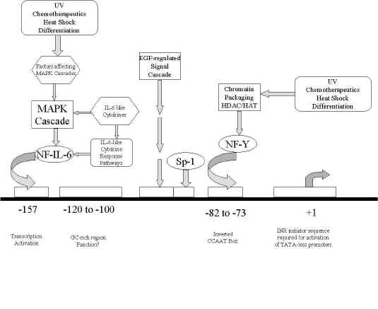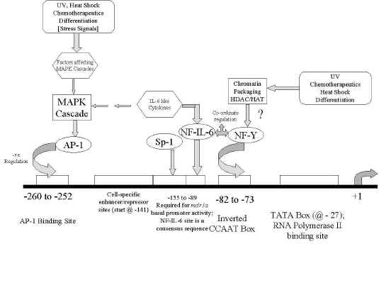 Cells can be made resistant to heat shock (a phenomenon known as "thermotolerance") in the same manner as they can be made drug resistant: Constant and increasing exposure to thermal stresses followed by drug selection conditions. Indeed, in rat hepatoma cells treated in such a manner, there is a correlation between the induction of HSF and the induction of mdr1 gene expression and activity (31). However, in vivo studies contradict these findings, as Vollrath et al (32) presented evidence showing that the rat mdr1 genes are not induced during heat shock. Nevertheless, as a substantial body of evidence exists detailing modulation of mdr1 expression by heat shock, the discrepancies in these studies may be due to difficulties incurred in controlling a heat shock response in a whole animal. Differences in regulation between normal and hepatoma cells, and between species (human and rat) may also play a role. However to date, it seems clear that MDR1 participates as a heat shock response gene in humans. More information in this area may evolve as it is now thought that the heat-shock proteins may play an undefined role in cancer and in the development of drug resistance. Figure 3: A chematic of the rat mdr1b promoter region, showing the relative locations of transcription factor binding sites, as well as interacting transcription factors and signal transduction pathways. The majority of rat mdr1a promoter regions have yet to be sequenced. IrradiationIn addition to initiating genetic mutations, ionizing radiation may initiate cellular responses that can ultimately affect mdr1 gene expression. Generally, irradiation has been observed to evoke increased rather than decreased mdr1 expression. It has been demonstrated that induction of MDR1 expression incurred by ultraviolet irradiation results from increased MDR1 gene transcription rates (33,34). Signaling of this induction is thought to primarily occur through a CCAAT box/NF-Y-binding site that is found in the MDR1 promoter (shown in Figure 1). Fractionated X-irradiation has also been found to increase PGP expression in CHO cells due to an increased protein stability and half-life with corresponding decreases in turnover rates (35-38). Indeed, increased PGP half-lives of more than 40 hours are found in irradiated cells as opposed to 17 hours in the control cell populations (36,37). Furthermore, the enhanced stability of PGP reportedly occurs without concomitant increases in mRNA levels (35,38). Evidence also suggests that the superstructure of chromatin plays a role in transcriptional regulation during UV irradiation. Specifically, the histone acetyltransferases and deacetylases that modulate DNA packaging into histones are believed to be involved. Jin and Scotto (39) reported that incubation of a human carcinoma cell line (SW620) with an inhibitor of histone deacetylase induces a 20-fold increase in MDR1 mRNA levels (39). The authors report that this induction likely occurs through an increased transcription, requiring the sequence from -82 to -73, which contains an inverted CCAAT box element, as point mutations of this sequence were found to abolish promoter response to the histone deacetylase inhibitor. The authors also postulated that ratios of acetyltransferase to deacetylase activities could be important in MDR1 regulation, with hyperacetylation leading to gene activation. Similarly, gel mobility shift assays establishing binding of NF-Y to the inverted CCAAT box and the involvement of NF-Y in intrinsic histone acetyltransferase activity also appear to indicate regulatory mechanisms of human MDR1 gene expression via chromatin acetylation/deacetylation pathways (39). It is unclear whether MDR1 overexpression during radiation exposure is a part of the cellular response to being irradiated or a side effect due to the stimulus. As discussed previously, sequences containing inverted CCAAT boxes were implicated by Ohga et al. (33,34) and by Jin & Scotto (39) in MDR1 induction imposed by UV irradiation. Of note is that this promoter sequence has also been implicated in induction imposed by various stimuli including differentiation (40), heat shock (41) and cytotoxic drugs (33) as this sequence is thought to play a role in maintaining basal MDR1 promoter activity (41,42). This implies that MDR1 may be induced by radiation through a general non-specific cellular response to environmental stress. Nevertheless, as radiation therapy is frequently used concurrent with antineoplastic drugs in cancer treatment, the effect of irradiation on cellular gene expression is certain to receive more attention in the years to come. Genotoxic stressRecently, much progress has been made in defining the signal transduction pathways that mediate cellular responses to DNA damage. Contributing to this response are multiple pathways involving alterations of phosphorylation of proteins and transcription factors which occur through several distinct protein kinases (ERK, JNK/SAPK, and p38/HOG1) as well as the tumor suppressor protein p53. In particular, the cyclic AMP responsive transcription factors such as NF- 6B, AP-1, Sp1 and CREB transduce signals in response to protein kinase C activation. To date, several lines of evidence demonstrating a correlation between protein kinase activity and mdr1 expression suggest that activation of cyclic AMP-dependent protein kinases may be involved in induction of the multidrug resistant phenotype in tumor cells (43). The c-Jun NH2-terminal protein kinase (JNK), a member of a well-characterized mitogen activating protein kinase cascade (44-47) is activated in response to many stressful stimuli including growth factors, phorbol esters, heat shock, UV irradiation, protein synthesis inhibitors, and inflammatory cytokines (46-51). It has been reported that JNK is activated in human carcinoma cells by treatment with a number of different anticancer drugs and this activation of JNK correlates with increased MDR1 expression (44). It is thus be
