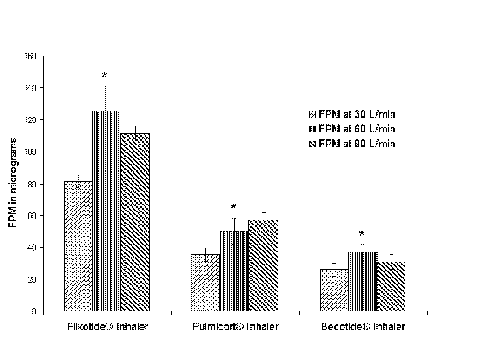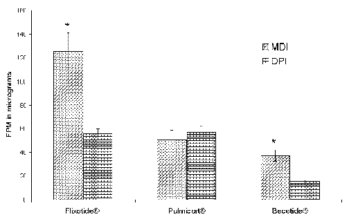 The aerosol performance of the MDI vs. DPI for the same drug and strength was evaluated at a simulated inspiratory flow rate of 60 L/min, which has been suggested as an optimum flow rate for DPIs (36). In addition the mean peak inspiratory flow rate (PIFR) in healthy humans was found to be 333 L/min in males and 214 L/min in females (18). While in asthmatic patients this PIFR is reduced to 59 (51-93) and 60 (26-103) as reported by Engle et al and Brown et al.(17,37). The FPM delivered from FPI and BCI were 1.2 and 1.4 fold greater respectively than corresponding DPIs, while no significant difference was demonstrated between the two dosage forms of budesonide (Fig 4).