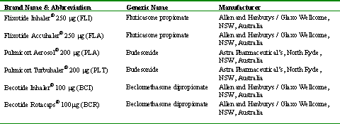 Beclomethasone dipropionate and dexamethasone 21-acetate (analytical standards) were purchased from Sigma Chemicals Co., (St. Louise, MO, USA). Budesonide was obtained by emptying a commercial Pulmicort Turbuhaler® Astra Pharmaceutical's (North Ryde, NSW, Australia). Fluticasone propionate was kindly donated by Glaxo Wellcome Group research (UK). Methanol and acetonitrile HPLC grade were purchased from Biolab scientific, (Clayton, South VIC, Australia). Analytical grade acetic acid was purchased from Rhone-Poulenc Chemicals (Clayton, South VIC, Australia). Glucocorticoid products used in this study are indicated in Table 1.