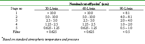 The Marple-Miller cascade impactors (MSP Corp. Minneapolis, MN, USA) Model 150 which were designed for operation at 30L/min and the 160 model for operation at 60 L/min and 90 L/min were used. Upon impaction the aerosol is divided into five size categories according to its aerodynamic diameter. The cutoff for the two impactors at different flow rates is shown in Table 2.