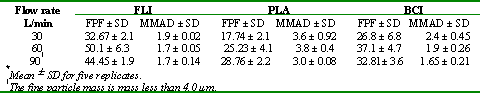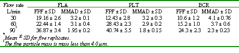 Increasing the flow rate from 30 L/min to 60 L/min was found to increase the FPM significantly by 53% for FLI and 42% for PLA and BCI. However there is no significant increase in the FPM when the flow rate increased from 60 L/min to 90 L/min. The increase in the FPM with a decrease in the MMAD found in the MDI products could be due to less turbulent deposition in the induction port at higher flow rate due to less mismatch between the velocity of the MDI plume and the surrounding sheath air. Our results are consistent with a previous in vitro study on b-agonists which demonstrated a 40% increase in the FPM of salbutamol sulphate when the flow rate was increased from 30 L/min to 55 L/min (35). Furthermore, the MMAD of the aerosolized particles was affected by the flow rate (Table 4), while the MMAD of FLI and the BCI decreased significantly when the flow rate increased from 30 L/min to 60 L/min, a significant decrease in the MMAD of PLA was demonstrated when the flow rate increased from 60 L/min to 90 L/min.
