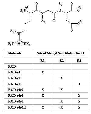 Molecular modeling programs SYBYL (V 6.4), MACROMODEL, SPARTAN (V 5.0) and MAREA were used to investigate possible conformations of RGD and its methyl analogs based on their ionization state at pH 7.4. The analogs were all of the mono-, di-, and tri-methyl derivatives of RGD (Figure 1).