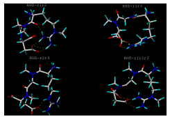 Figure 2: [Panel(b)]. Computer generated lowest energy conformations of RGD-r1r2, RGD-r1r3, RGD-r2r3 and RGD-r1r2r3 analogs using SYBYL after annealing, minimization, solvation and extraction. The pictures show the number and sites involved in potential intramolecular H-bond formation. Dotted lines indicate intra-molecular H-bonds. For key to structures see Figure 1.