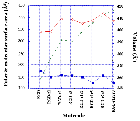 Results . Parameters such as polar and total surface area, volume, and Log P were found to vary with both the number and the sites of methyl substitution on the RGD molecule. The calculated as well as the experimental Log P values were found to be less than minus 2. The calculated maximum cross-sectional diameters ranged from 9 to 12 Å. No detectable transport was noted.
