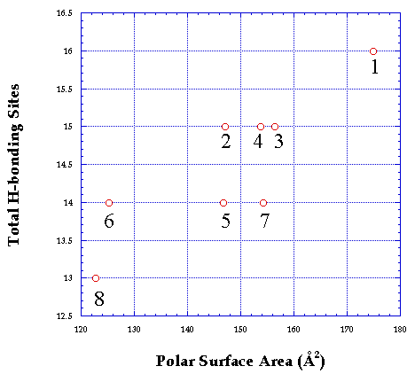 Figure 4: Correlation between polar surface area and total hydrogen bonding potential of the RGD analogs. (1) RGD, (2) RGD-r1, (3) RGD-r2, (4) RGD-r3, (5) RGD-r1r2, (6) RGD-r1r3, (7) RGD-r2r3, (8) RGD-r1r2r3. For key to structures see Figure 1.