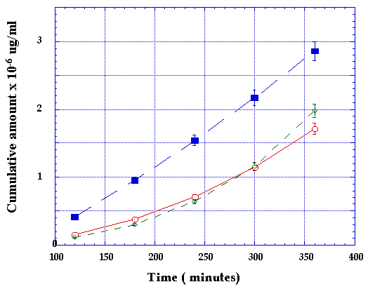 Figure 6: Transepithelial transport of gly-sar at pH 6 (n), gly-sar at pH 7.4 (ŕ) and Gly-sar in the presence of RGD at pH 6 (o).