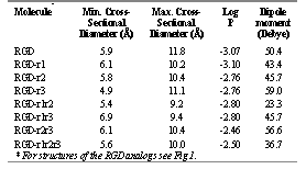 Table 3: Cross-sectional diameters, calculated log P values (ACD) and dipole moments of arginine-glycine-aspartic acid (RGD) analogs