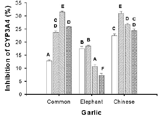 Table 4. Inhibition of various cytochrome P450 3A isoforms by phosphate buffer extracts of fresh garlic ( n > 6; mean percent inhibition ± SD)