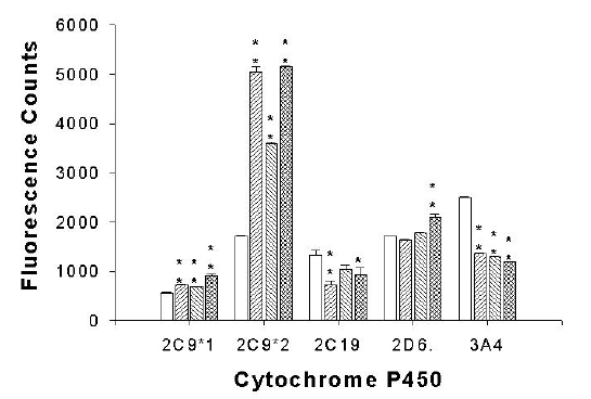 Figure 2: Activity of 3 different fresh garlic extracts on the metabolism of cytochrome P450 isozyme marker substrates: 7-methoxy-4-trifluoromethyl-coumarin (2C9*1, 2C9*2), 7-ethoxy-3-cyanocoumarin (2C19), 3-[2-(N,N-diethyl-N-methylamino)ethyl]-7-methoxy-4-methylcoumarin (2D6), and 7-benzyloxyresorufin (3A4). Bars correspond to control (O), common garlic (//), elephant garlic (\\), and Chinese garlic (X) fractions. Data was analysed by a one-way ANOVA (n $ 9; mean " SEM) for each isozyme, followed by a pairwise comparison utilizing Dunnett=s test (* indicates a significance of p < 0.050; ** indicates a significance of p < 0.001).