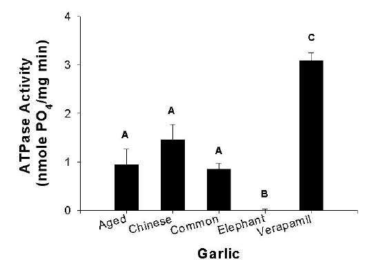 Figure 3: P-glycoprotein-ATPase activity of aqueous extracts of aged garlic capsules and 3 fresh garlic varieties (25 mg/ml) compared with 20 μ M verapamil as the positive control. Data was analysed by a one-way ANOVA (n = 9; mean ± SEM) followed by Tukey's multiple range test. Means with the same letter are not significantly different (p > 0.05).