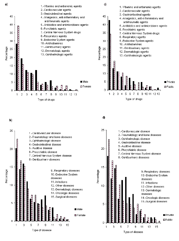It should be noted that when comparing the presence of certain conditions like sex and among nursing homes, the first place are cardiovascular diseases, corresponding to the second group of drugs most consumed by the elderly (cardiovascular agents). This may be due to the fact that the first group of drugs includes vitamins and anti-anemic medications, very frequently prescribed to this type of subjects. Bone diseases and traumas placed second in frequency. The group of analgesics, anti-inflammatory and anti-rheumatic drugs occupies fourth place.