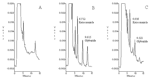 Figure 2. Representative chromatograms of: A) blank pasma, B) plasma spiked with 150 ng/mL ketoconazole (IS) and 100 ng/mL glyburide and, C) plasma sample from a subject 2 h after administration of 5 mg glyburide tablet, the concentration of glyburide is 51.7 ng/mL.