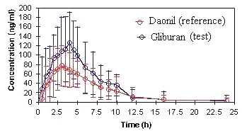 The bioequivalency of two glyburide products, reference and generic formulation was compared in 26 healthy male volunteers who received a single 5 mg oral dose in crossover design. As shown in (Figure 3) the generic lot that exhibited a wide difference in bioavailability compared to the reference product. The peak plasma levels were significantly higher for test product than reference.