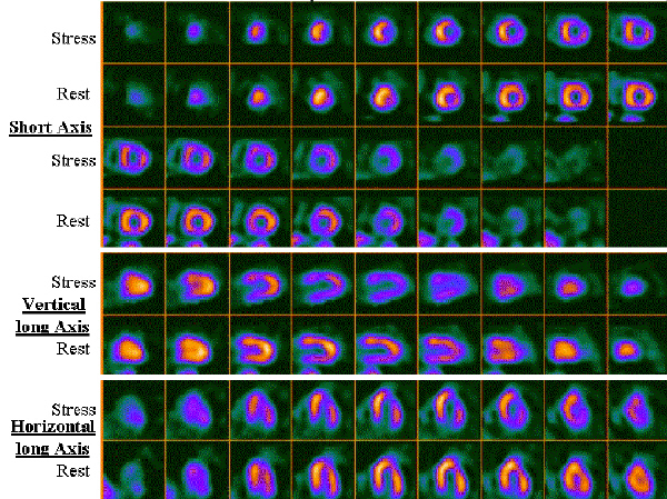 The rest images show normal perfusion, the stress images, however, show lack of perfusion in the anterior and lateral walls when compared to the rest images. The computer display presents three orientations of the heart. The first orientation is the short axis. The heart is oriented with its apex toward the viewer and the series of images in that row represent parallel, sequential images or slices of tissue starting at the tip of the apex and cutting across the left ventricle. The hole in all images represents the left ventricle cavity. The second and third representations are called vertical and horizontal long axis where the heart is oriented for the viewer to see both the apex and base of the left ventricle. In the vertical axis display the images are sliced from septum to lateral wall (and the horizontal axis displays the tissue with the slices from inferior to anterior wall).