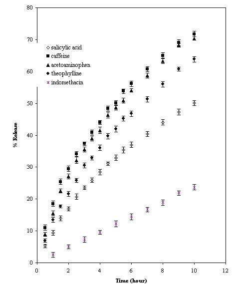 Single face release experiments were performed at 37°C. The sample holder was immersed in 900ml-distilled water for caffeine, acetaminophen, theophylline, salicylic acid and phosphate buffer pH 7.2 for indomethacin. Sink condition was followed for the whole experiment, as the volume of dissolution medium was above 10 times the solubility of drugs in dissolution medium. Agitation of 100 rpm was provided and concentration of drug in the dissolution medium was measured as a function of time. The concentration of caffeine, acetaminophen, theophylline, salicylic acid and indomethacin were determined by monitoring the UV absorbance of the dissolution medium at 273, 242, 271, 297 and 318nm respectively (Table 2). The experiments were done for each batches and average values are reported.