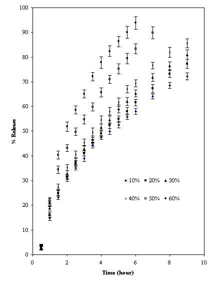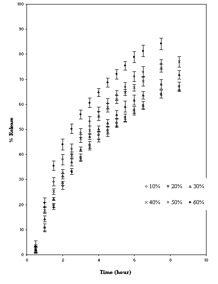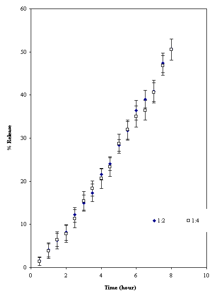 The release could be sustained at constant rate for longer period than with uncross-linked material. The effect of drug loading had no effect on the percent of release (Fig. 6). The slow rate of drug release could be due to slow water penetration due to presence of numerous intergranular hydrogen bonds and presence of gel barrier (16). This shows that by controlling degree of cross-linking the release kinetics can be optimized to desire design.
