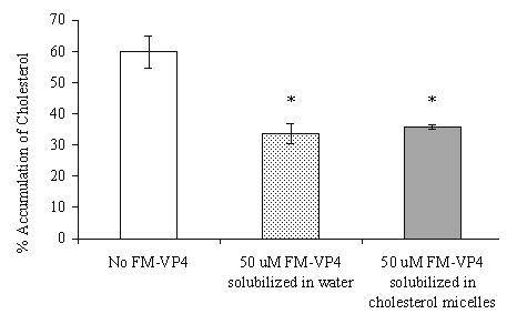 Figure 2: The effects of the delivery mode of FM-VP4 (solubilized in water or incorporated into cholesterol-containing micelles) on the accumulation of [3H]cholesterol from micelles in differentiated Caco-2 cells. *Percent accumulation of [3H]cholesterol is significantly lower than control (no FM-VP4, p<0.05), n=3 in each group.