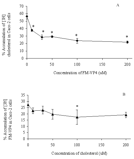 Figure 5: The effects of concentration of unlabeled A) FM-VP4 and B) cholesterol on the accumulation of [3H]cholesterol and [3H]FM-VP4, respectively, in confluent Caco-2 cell monolayers. [3H]Cholesterol-containing micelles (50 μM total cholesterol with 1.27x10-4% [3H]cholesterol) or [3H]FM-VP4 (50 mM) was incubated on the apical side of differentiated Caco-2 cell monolayers for 4 h at 370C in the absence or presence of 10-200 mM unlabeled FM-VP4 or cholesterol, respectively. Percent accumulation is the amount of radiolabel associated with Caco-2 cells compared to the respective untreated control, n=3 in each group. * p<0.05 in treated groups compared to control without A) FM-VP4 or B) cholesterol