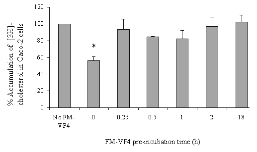 Figure 6: The effects of 50mM FM-VP4 pre-incubation (0, 0.25, 0.5, 1, 2 and 18 h) on [3H]cholesterol accumulation in confluent Caco-2 cell monolayers. [3H]Cholesterol-containing micelles (50 mM total cholesterol with 1.27x10-4 % [3H]cholesterol) were incubated on the apical side of differentiated Caco-2 cell monolayers after pre-incubation with FM-VP4 for up to 18 h in complete media at 370C in the absence of 50 mM cholesterol. Percent accumulation is the amount of radiolabel associated with Caco-2 cells compared to the untreated control, n=3 ineach group. *Percent accumulation of radiolabel in treated groups is significantly lower than control (no FM-VP4, p<0.05).