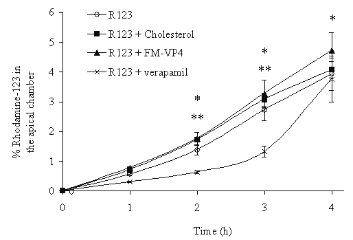 Figure 7: P-glycoprotein activity in the presence of cholesterol, FM-VP4 or verapamil, a known p-glycoprotein inhibitor, (each 50 mM) in Caco-2 cell monolayers. P-gp activity was measured by adding rhodamine 123 (5 mM) to the basolateral side and determining apical accumulation by fluorescence. Significant differences were determined by a Tukey-Kramer post-hoc test after a one-way ANOVA, n=3 in each group. *p<0.05 vs. Rhodamine 123 (R123) for all treatment groups (cholesterol, FM-VP4, verapamil) compared to control at 1 h. **p<0.05 vs. Rhodamine 123 (R123) for verapamil only compared to control at 2 and 3 h.