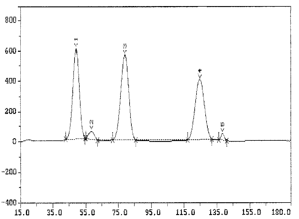 In HPTLC analysis, harmine and harmaline were separated from each other with Rf values of 0.66 and 0.21 respectively (Figure 1). Harmane (Rf 0.70) was not detected in the extract. The plots of the ratio of peak area of the alkaloids to quinidine sulfate (Rf 0.40), which was used as an internal standard, versus concentration, were straight lines with slopes of 0.0274 (r2 = 0.9897) for harmine and 0.0211 (r2 = 0.9925) for harmaline. Using this method, it was found that each gram of dried extract contained 55.5 and 79.0 mg of harmine and harmaline respectively.