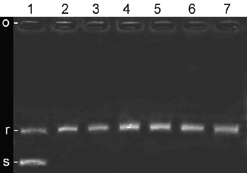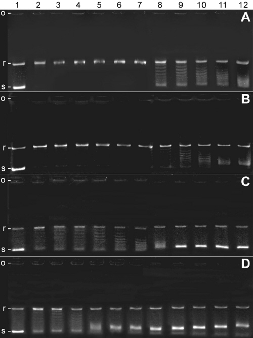 A: P. harmala seeds extract; B: harmaline; C: harmane; D: harmine. Positions of origin, relaxed and supercoiled plasmids have been shown on the left side by o, r and s letters respectively. Lane 1: supercoiled pBC KS DNA, lane 2: no drug, lanes 3-12: 5, 10, 20, 30, 40, 50, 100, 150, 200 and 250 mg/ml of corresponding drug, respectively.
