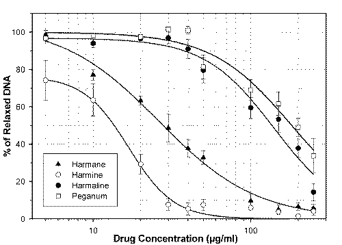 Figure 4: Dose response curves for effects of harmane (▲), harmine (o), harmaline (●) and P. harmala seeds extract (o) on topoisomerase I mediated DNA relaxation: The proportion of relaxed DNA to total DNA was measured by scanning with an ImageMaster 1D digital imaging system (Pharmacia Biotech). Data points represent the mean ± S.E.M. of three independent experiments.