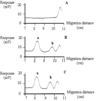 Figure 1: Plasma chromatograms of blank plasma (A), plasma spiked with 5000 ng/mL theophylline (B) and plasma of a healthy subject collected 6h after taking a 200-mg single oral dose of TheoDur (C); [a, Theophylline b, Acetaminophen (internal standard)]