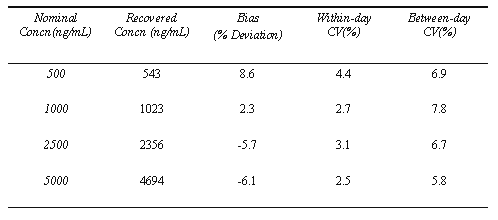 Within-day and between-day assay coefficients of variation and accuracy test results are summarized in Table-1. Within-day and between-day coefficients of variation were less than 4.4% and 7.8% respectively. Bias of the assays was between -6.1 and 8.6. Efficiency of the extraction procedure was about 85% for theophylline.