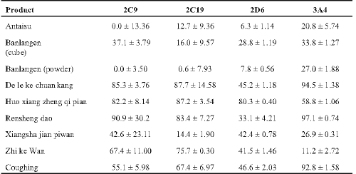 Results. One product was found to be a Chinese Proprietary Medicine (CPM). Most aqueous extracts inhibited CYP450 mediated-metabolism of at least 3 isozymes (ranging from 25 - 100%). All liquid samples markedly inhibited the metabolism of all 4 isozymes. De le ke chuan kang and Rensheng dao were the strongest CYP450 inhibitors.