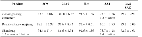 Table 2: Percent inhibition of human cytochrome CYP450 isozymes by aqueous extracts of powdered Chinese herbal products (n > 6 ± SD).