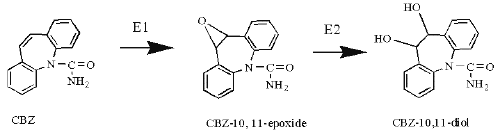 Figure 1: The epoxide-diol pathway of CBZ metabolism. E1-monooxygenase, E2-epoxide hydrolase.