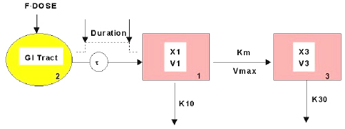 A linear pharmacokinetic model of one compartment with first order absorption was previously used by several investigators to describe CBZ and CBZ-E plasma data (18-20). Simultaneous fitting technique was said to be better for the estimation of CBZ-E kinetic parameters (18). However, in rat liver, the formation kinetics of CBZ-E followed Michaelis-Menten kinetics (21). Sumi et al. applied deconvolution technique and Lineweaver-Burk plot to estimate Vmax and Km values of CBZ epoxidation process in humans. They employed a two compartment open model with Michaelis-Menten kinetics for CBZ-E formation process and yielded a good simulation result (22). In the present study, a pharmacokinetic model describing CBZ and CBZ-E plasma profiles following the multiple dosing of Carbatrol® and Tegretol-XR® were developed using simultaneous fitting technique in ADAPT II, Release 4.0 (23). A one-compartment model with zero order input, first order elimination and Michaelis-Menten kinetics were selected to describe the fate of plasma CBZ and CBZ-E. The work was undertaken using data obtained previously (17).