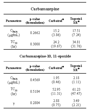 Table 1 presents the mean and standard deviation (n=15) of CBZ and CBZ-E fitted pharmacokinetic parameters following administration of Carbatrol® and Tergretol-XR®.
