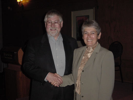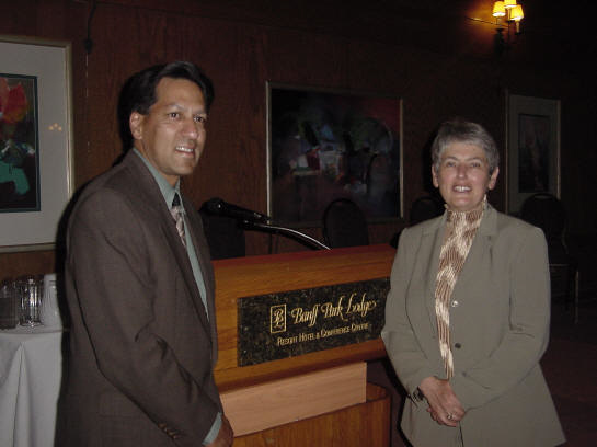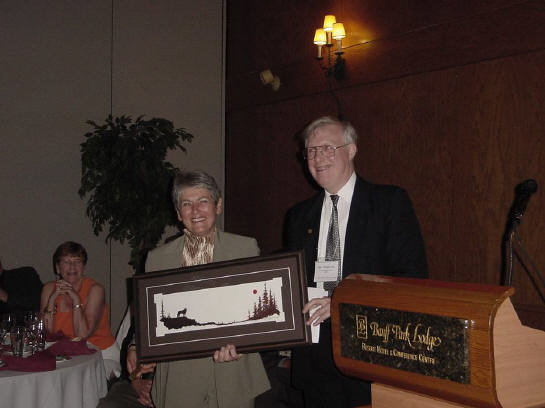 Dr. David Dolphin is congratulated by Dr. Elizabeth Vadas, upon receiving the CSPS Award of Leadership In Pharmaceutical Sciences. The award was share